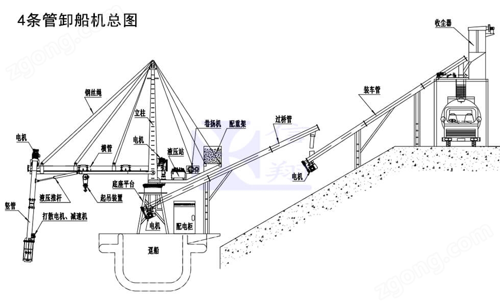 螺旋卸船機(jī)主要由豎管總成(垂直豎管)、橫管總成、橫管托梁、吊塔、底盤、回轉(zhuǎn)軸承、動(dòng)力、液壓系統(tǒng)、配電系統(tǒng)、支架組成。